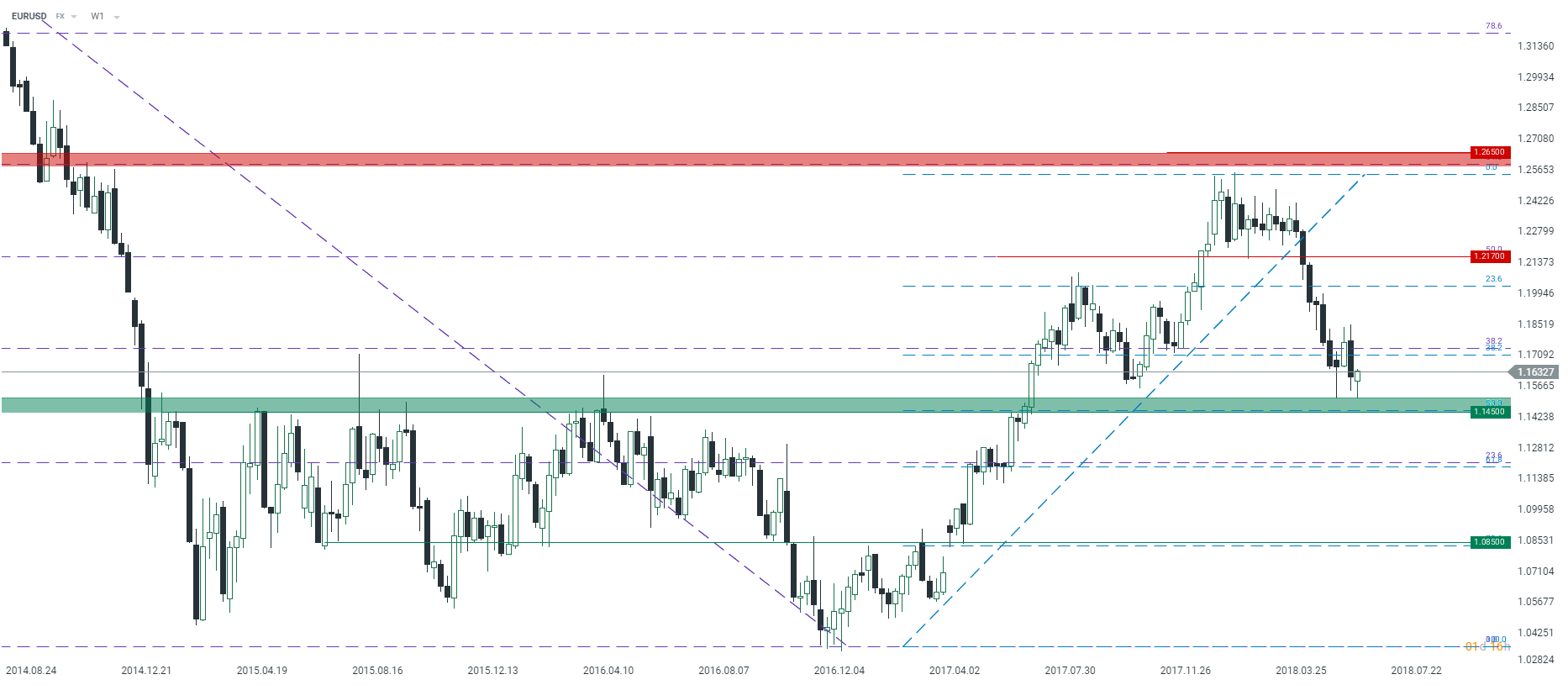 Czy piątek będzie przełomowym dniem dla EURUSD? Na wykresie tygodniowym można zauważyć, że cena jest w stanie utrzymać się znacznie powyżej strefy 1,1450. Jeśli kupujący ponownie przejmą kontrolę na rynku, możemy mieć do czynienia z lepszym okresem dla europejskiej waluty. Źródło: xStation5