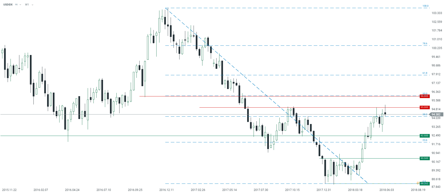 Indeks dolara (USDIDX) nie był w stanie pokonać poziomu 95. W takim wypadku rysuje nam się niedźwiedzia świeczka na wykresie tygodniowym. Podobną sytuację mieliśmy trzy tygodnie temu, co wzmacnia podażową wymowę obecnej sytuacji w ujęciu technicznym. Źródło: xStation5