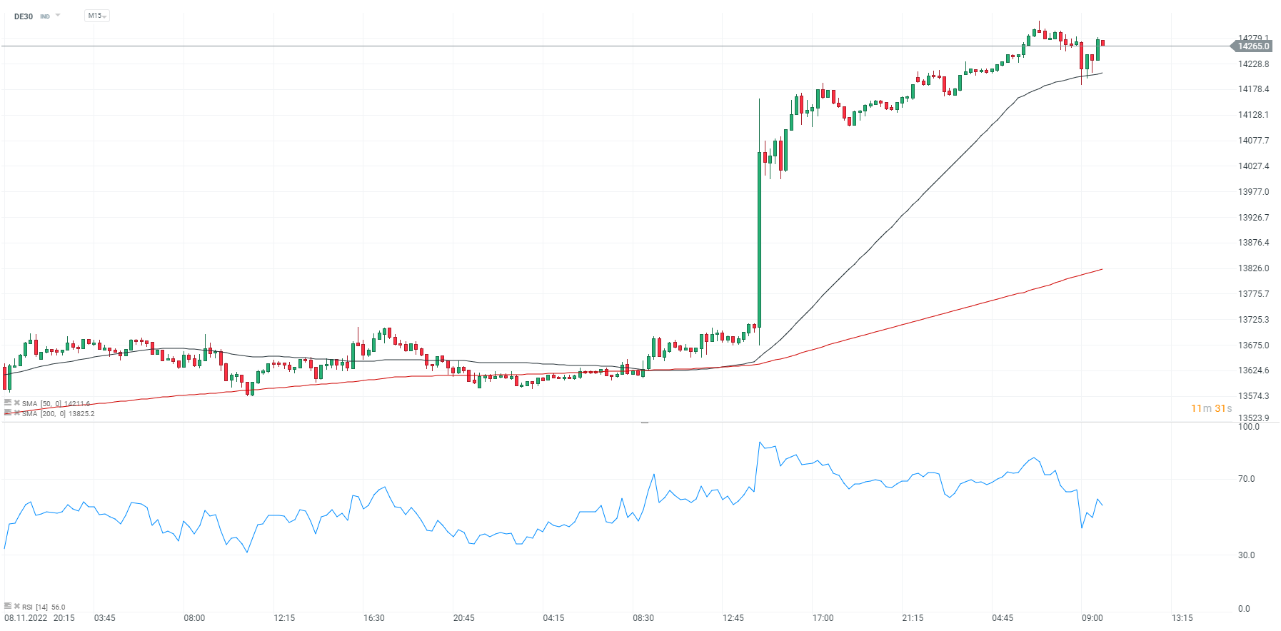 Wykres DE30, interwał M15. Byki próbują kontynuować dynamiczny ruch w górę i odwrócić spadkowy trend. Korekta została powstrzymana na 50 sesyjnej średniej kroczącej (czarny kolor). Źródło: xStation5