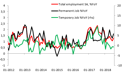 Wzrost całkowitego zatrudnienia od kilku miesięcy utrzymuje się poniżej 5%. Źródło: XTB, Macrbond.