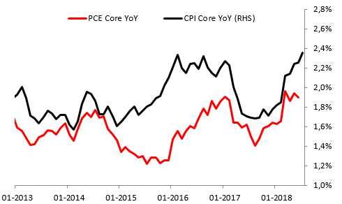 W ujęciu rocznym inflacja bazowa CPI ponownie przyśpiesza w okolice 2,4%. Ulubiona miara FOMC PCE Core w dalszym ciągu utrzymuje się w okolicach celu inflacyjnego - 2%. Źródło: XTB, Macrobond.