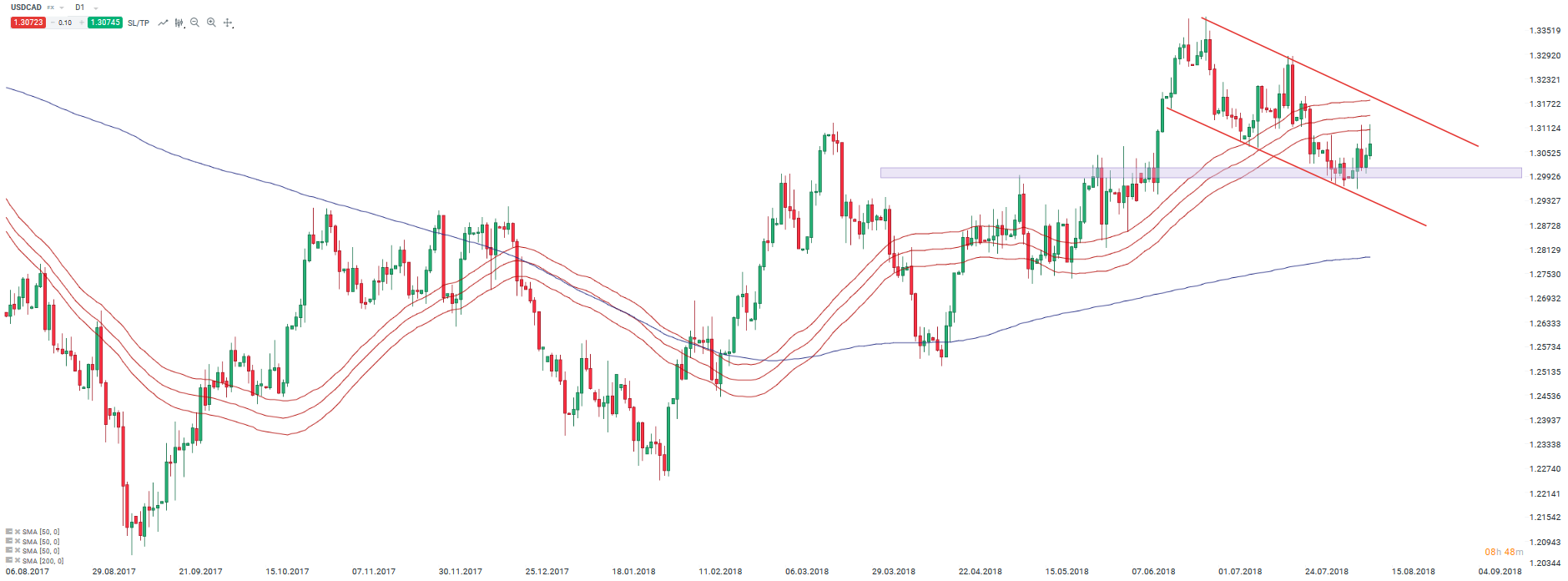 USDCAD odbija od dolnego ograniczenia kanału oraz poziomu 1,3000. Źródło: xStation5.