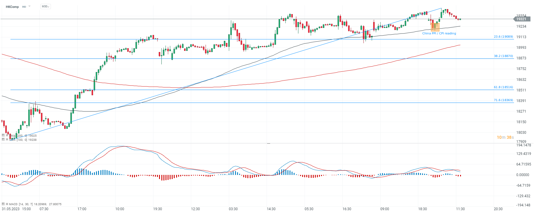 Indeks HKComp, interwał M30. Indeks utrzymuje wzrostowe momentum i wciąż notowany jest powyżej SMA100 (czarna linia). W razie spadków potencjalne wsparcie stanowić może poziom 19 100 pkt wyznaczony 23,6 zniesieniem Fibo fali wzrostowej z końca maja oraz poprzednimi reakcjami cenowymi. Główny, psychologiczny opór znajduje się na poziomie 20,000 pkt. Źródło: xStation5