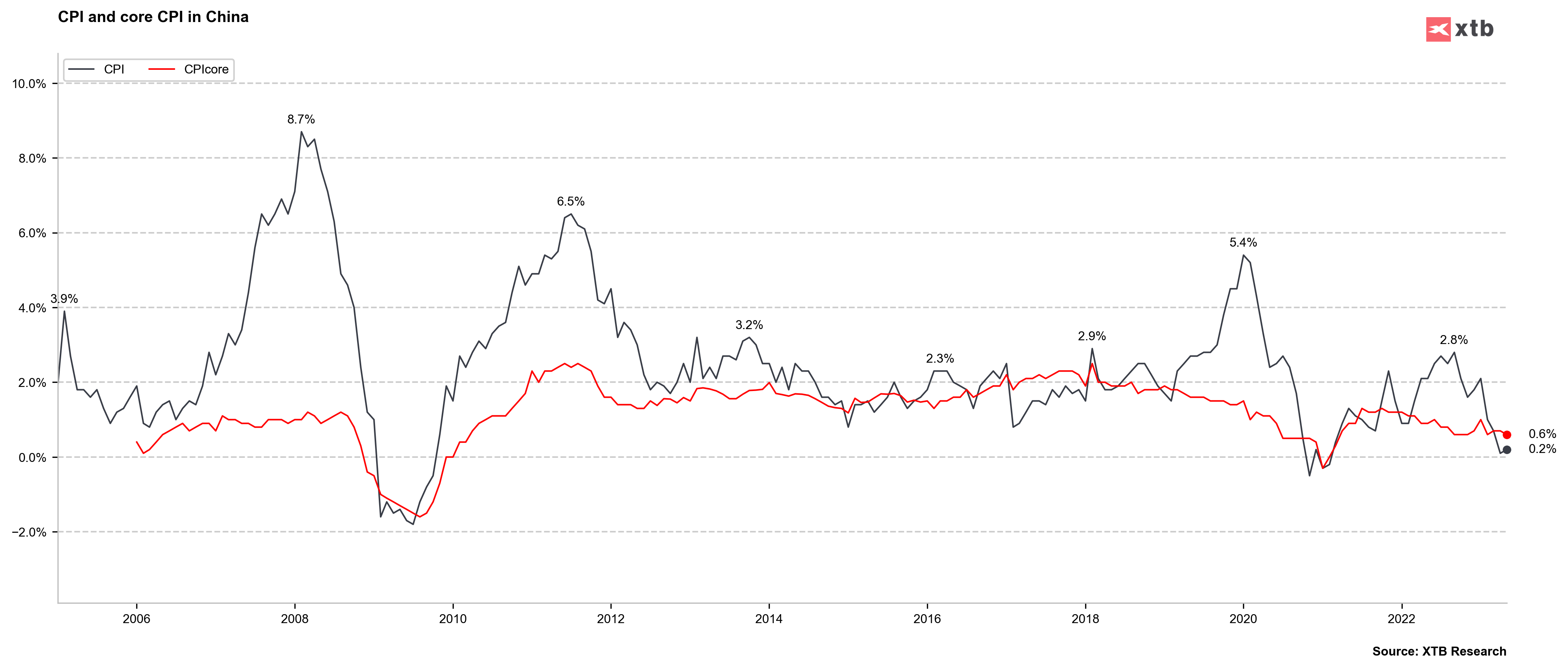 Zarówno bazowa jak i inflacja CPI Chin znajduje się na historycznie niskich poziomach. Źródło: XTB Research