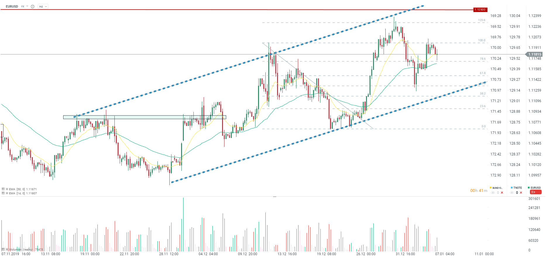 EURUSD ogranicza spadki z poranka, reagując na strefę popytową związaną ze srednimi 14 oraz 50 okresowymi wraz ze zniesieniem 78.6 ostatniej dużej fali spadkowej. Źródło: xStation5