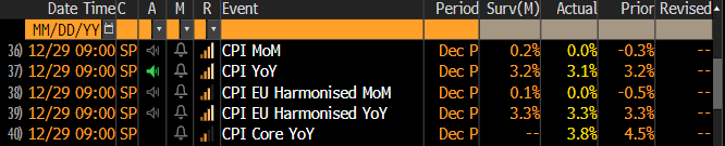 Wstępny odczyt Inflacji CPI w Hiszpanii za grudzień wypadł poniżej oczekiwań. Odczyt wypadł na poziomie 3,1% w ujęciu rocznym (oczekiwano 3,2%), a odczyt w ujęciu miesięcznym wyniósł 0% (oczekiwano 0,2%). Inflacja bazowa wykazuje dosyć gwałtowny zjazd z 4,5% w ujęciu r/r do 3,8%.