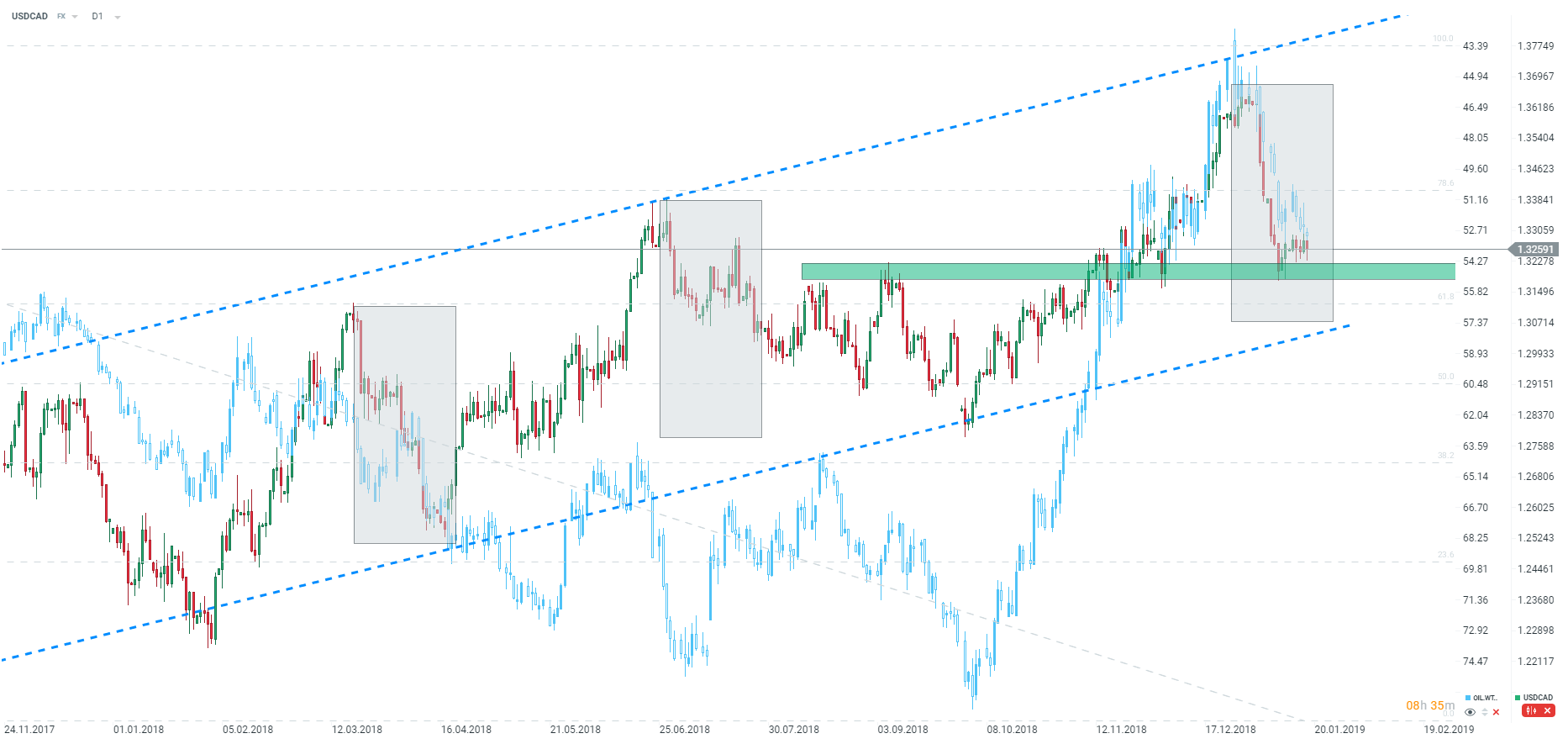 Para USDCAD utrzymuje się powyżej ważnej strefy popytowej przy poziomie 1,3200. Jeżeli ropa naftowa będzie kontynuować wzrosty można spodziewać się potencjalnego dalszego umocnienia dolara kanadyjskiego. Kluczowe poziomy wsparcia zlokalizowane są przy zniesieniu 61.8 oraz przy dolnym ograniczeniu wzrostowego kanału trendowego. Źródło: xStation5