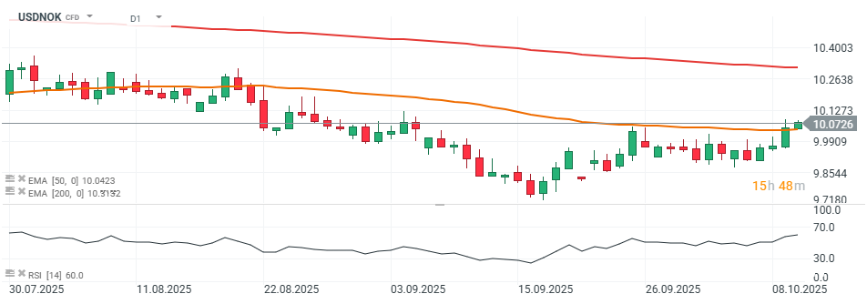 Inflacja w Norwegii, we wrześniu wzrosła o 3,6% r/r wobec 3,5% prognoz i 3,5% poprzednio. Miesięczna dynamika wskazała 0,4% po spadku o -0,6% w sierpniu. Para USDNOK przebiła dziś EMA50 na interwale dziennym oraz opór wyznaczony poprzednimi reakcjami cenowymi na poziomie 10.00 i wydaje się zmierzać do kluczowej strefy oporu, przy EMA200.