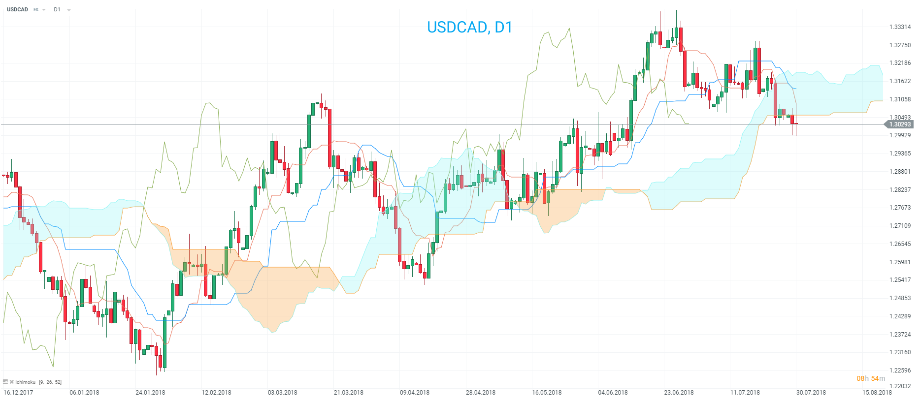 Para walutowa USDCAD spadła poniżej chmury Ichimoku na wykresie D1. Potencjalnym następstwem tego może być zmiana trendu. Źródło: xStation5