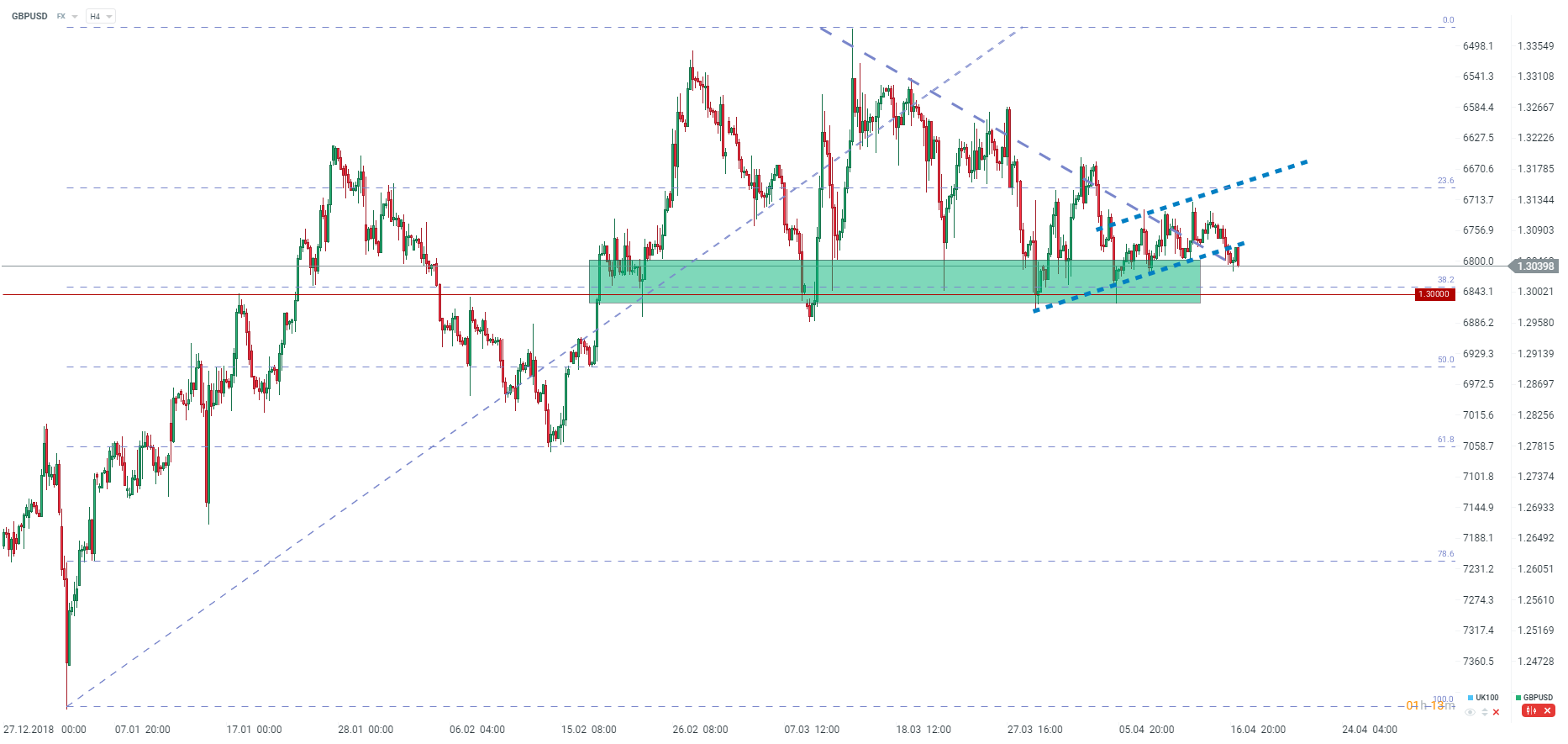 Funt nieco osłabia się po publikacji tych danych, ale nie zwiększa pułapu spadków z dzisiejszej sesji. Testowane są okolice górnego ograniczenia strefy popytowej. Źródło: xStation5