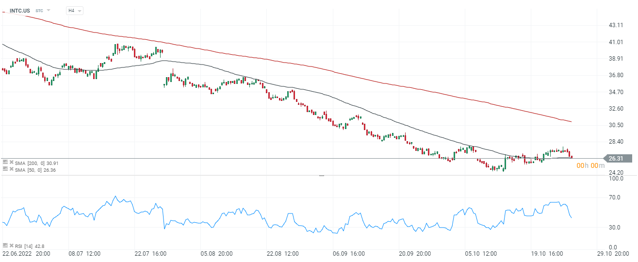Wykres akcji Intel (INTC.US), interwał H4. Walory repsektują kluczowy opór, który przebiega przy SMA200. Otwarcie wskazuje na poziomy w okolicach 28 USD, kurs akcji pierwszy raz od lipca prawdopodobnie odbije się od wsparcia przy 50 sesyjnej średniej kroczącej, które przebiega przy cenie z wczorajszego zamknięcia 26,3 USD. ródło: xStation5