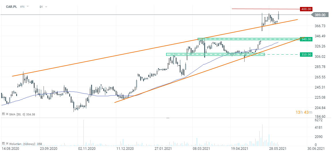 Walory Inter Cars (CAR.PL) zyskują dziś nieco ponad 4%, sięgając nowych historycznych szczytów intraday. Po zakończeniu wczorajszej sesji spółka przedstawiła dane o przychodach ze sprzedaży za maj 2021. Skonsolidowane przychody grupy Inter Cars wyniosły w maju 978 mln PLN, co oznacza wzrost o 37% r/r. Narastająco od początku roku grupa wypracowała 4 454,7 mln PLN przychodów ze sprzedaży (+37,4% r/r).