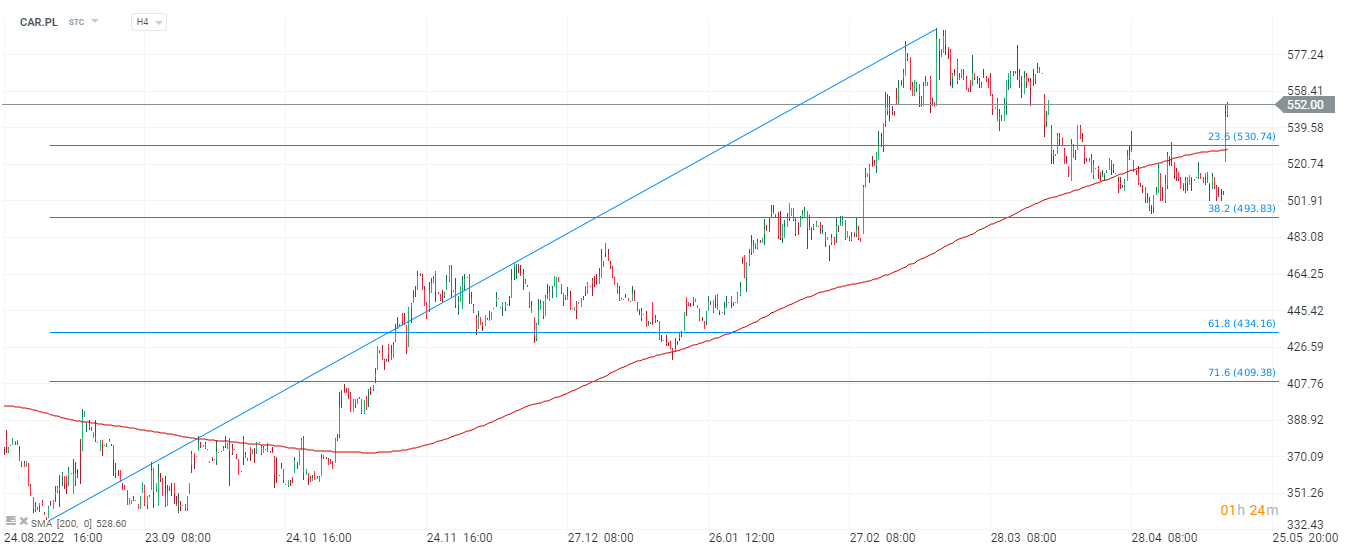 Akcje InterCars (CAR.PL), interwał H4. Walory spółki notują dziś dynamiczną zwyżkę, która przebiła się powyżej kluczowych oporów tj. SMA200 (czerwona linia) i 23,6 zniesienia Fibonacciego przy 530 PLN za akcję. Źródło: xStation5