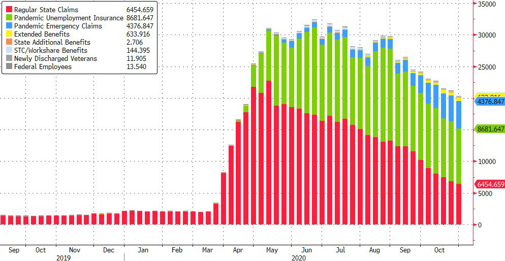 Zestawienie wszystkich wniosków o zapomogę w związku z bezrobociem. Źródło: Zerohedge, Bloomberg