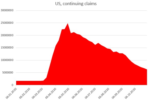 Dzisiejsze dane dotyczące wniosków o zaisłek wypadają bardzo interesująco. Z jednej obserwujemy wciąż spory spadek wniosków kontynuowanych (są to jednak dane opóźnione pochodzące sprzed 2 tygodni). Odczyt na poziomie 6,3 mln przy oczekiwaniu 6,47 mln oraz przy poprzednim poziomie 6,8 mln.
