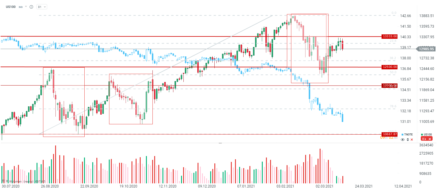 Kolejny dzień i kolejne możliwe objęcie bessy na US100. Wczoraj nie udało się wyjść powyżej 13333 punktów na Nasdaq. Źródło: xStation5