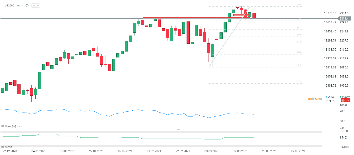 US2000 również z potencjalnym objęciem bessy po wczorajszym wzroście. Dzisiaj kolejny raz testowane jest ważne wsparcie. Źródło: xStation5