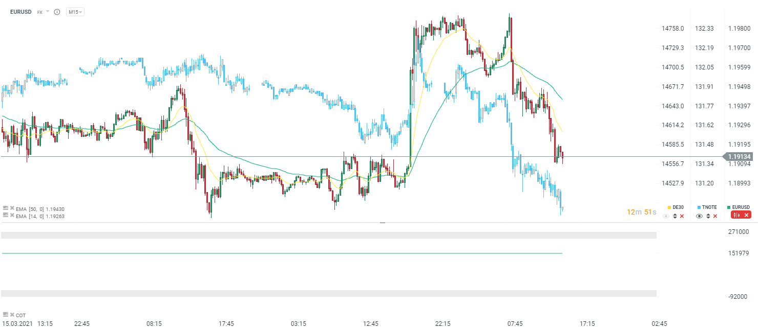 EURUSD jest już przy poziomie z początku wczorajszej decyzji Fed. Kluczowe wsparcie to oczywiście okolice 1,1900, ale TNOTE wskazują, ze właśnie tam powinien znaleźć się EURUSD. Źródło: xStation5
