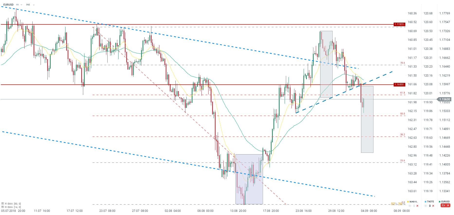 Dolar amerykański kontynuuje wzrosty, choć w przypadku ostatnich godzin widać raczej realizację zysków wobec publikacji dobrych danych. Para EURUSD wybiła się dzisiaj z linii trendu wzrostowego, która była jednocześnie potencjalną linią szyi formacji RGR. Zrealizowano ok. 1/3 tej formacji,