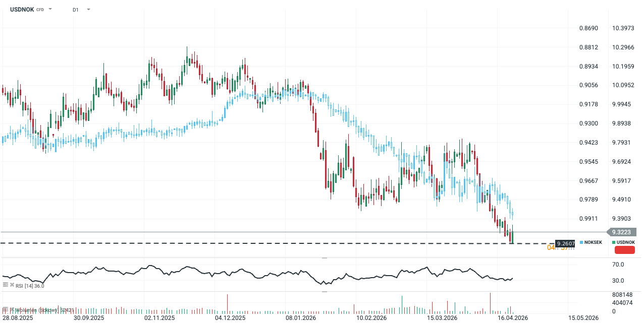Risk-off widać zwłaszcza, gdy porównany wzrosty USDNOK do wzrostów na NOKSEK (niebieski, odwrócony). Źródło: xStation5