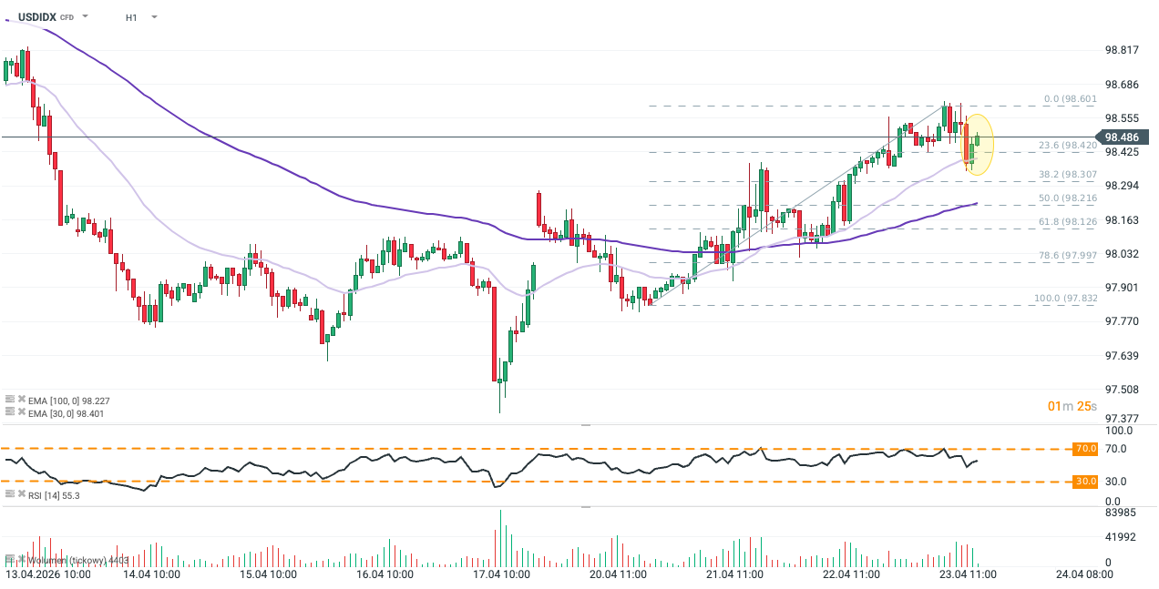 USDIDX odbił się od EMA30 na interwale H1. Źródło: xStation5