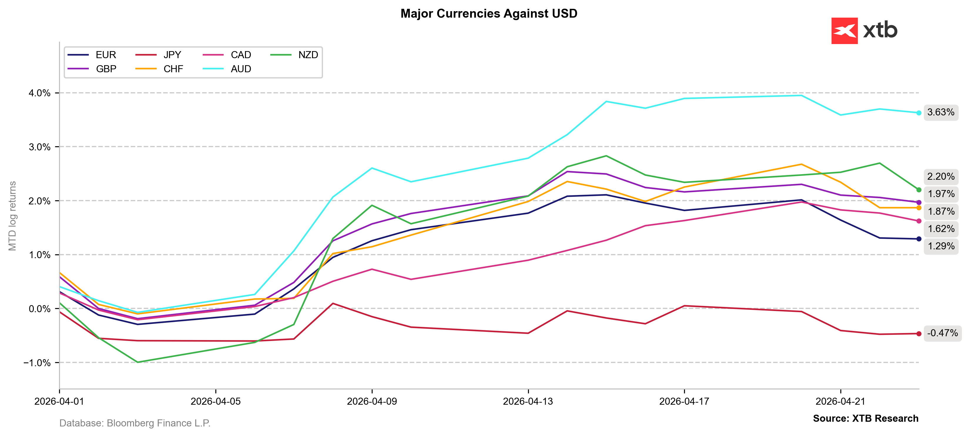 Pomimo dzisiejszej korekty, NZD (zielony) wciąż ma za sobą relatywnie lepszy miesiąc względem dolara niż reszta walut G10. Źródło: XTB Research