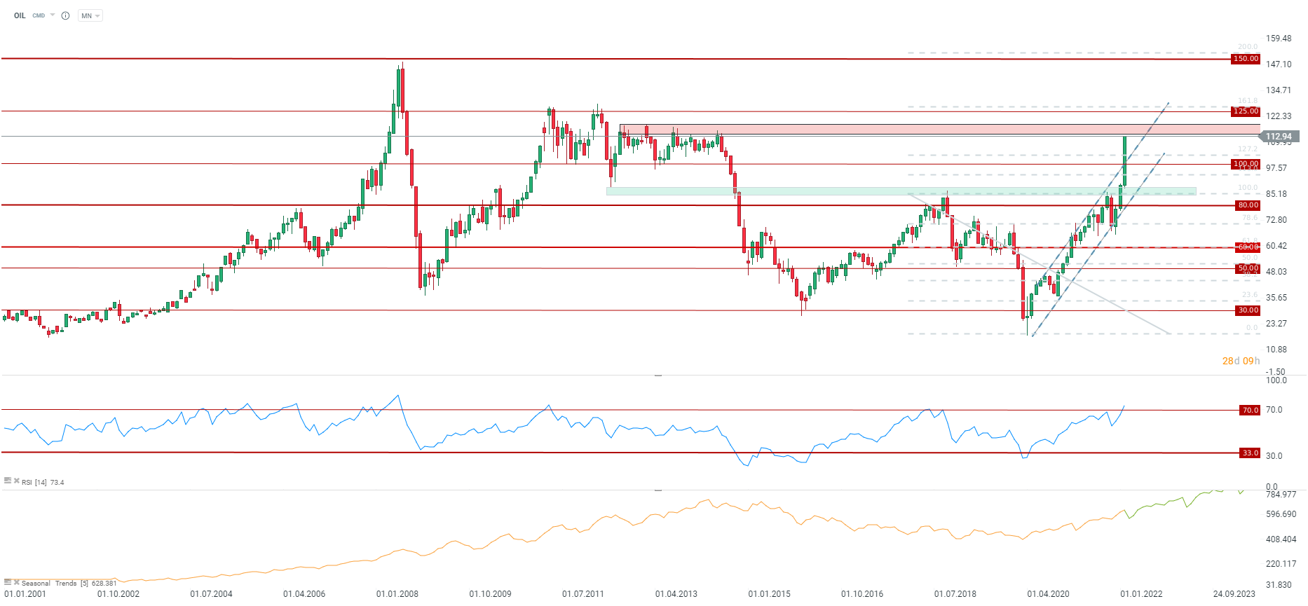 Takie tezy stawia już Saxo Bank czy odpowiednio Bank of America. Bloomberg wskazuje na rosnące zainteresowanie opcjami przy tych poziomach, choć są na ten moment jeszcze względnie tanie. Rosja jest ważnym graczem na rynku, ale możliwym i wartym do zastąpienia. Obecna sytuacja różni się od tej, którą mieliśmy w 2008 roku. Większa podaż jest możliwa, choć jednocześnie chwilowe problemy z logistyką mogą doprowadzić do wzrostu cen z obecnych poziomów. Nie jest wykluczona, że cena wzrośnie powyżej 120 dolarów za baryłkę, a poziom 150 USD też nie wydaje się abstrakcyjny. Z drugiej strony te poziomy mogą wywołać już totalną destrukcję popytu, tak jak było to w 2008 roku i rozpocząć kolejny silny kryzys na globalnych rynkach.