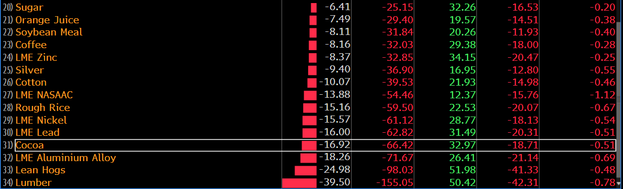Bardzo silnie wyprzedawane były metale przemysłowe oraz szlachetne. Sporo straciły tzw. „softy” czyli przede wszystkim cukier i kawa, choć największe straty zanotowane były na kakao. Niemniej kakao spadało z okolic wielomiesięcznych szczytów, natomiast kakao i cukier traciły kontynuując długoterminowy trend spadkowy. Surowce w największym stopniu dotknięte wojnami handlowymi to trzoda chlewna, drewno oraz soja.