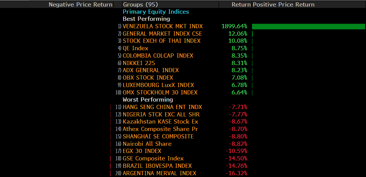 W przypadku indeksów w oczy rzuca się oczywiście wzrost akcji na wenezuelskiej giełdzie. Ten wzrost jest tak duży oczywiście tylko z pozoru. Jest on związany z dalszym dużym spadkiem boliwara względem euro oraz utrzymywaniem sztucznego oficjalnego kursu wymiany przez państwo.