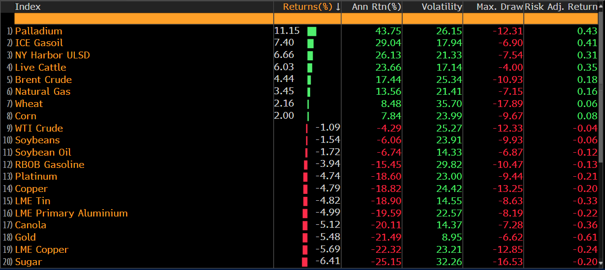 Indeks surowców liczony przez Bloomberga zaliczył spadek zarówno w ostatnim kwartale jak i w minionym miesiącu. Pomimo wzrostu cen niektórych kluczowych surowców, indeks surowców stracił 2,5% w minionych trzech miesiącach. Mimo tego wzrost cen ropy Brent, gazu naturalnego kukurydzy oraz pszenicy doprowadził do ograniczenia potencjalnego większego spadku. Wzrosty były skromne, ale udział tych surowców wystarczył, aby indeks cen surowców wciąż pozostawał stosunkowo wysoko i urósł w ostatnich tygodniach. Jak widać po niemrawych początkach w tym roku zyskał pallad na rzecz podobnego metalu pod względem użytkowania, czyli platyny.