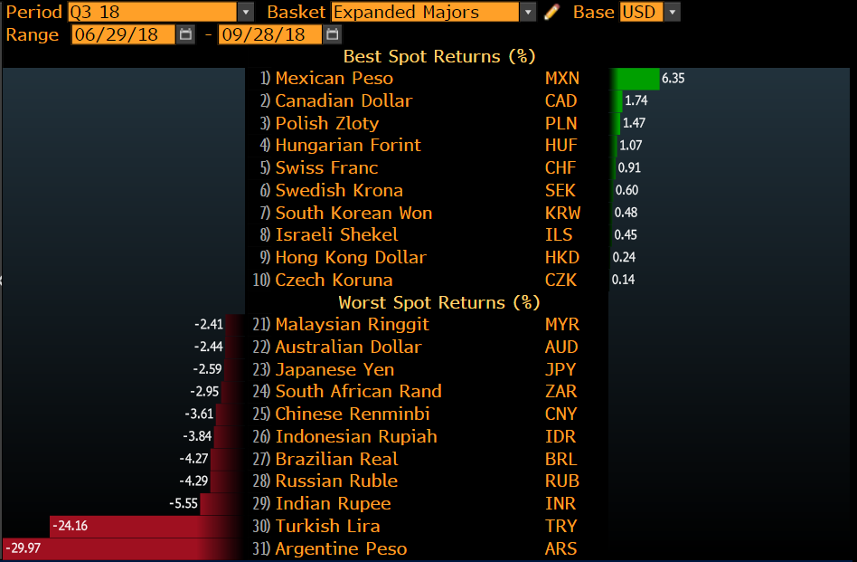 Jak widać III kwartał był stosunkowo mieszany. Dolar stracił swoją dominację, choć nie oddał wiele zysków bazując na najlepszych walutach w minionych trzech miesiącach. Zyskało peso i dolar kanadyjski ze względu na lepsze oczekiwania dotyczące porozumienia handlowego. Z rynków EM na uwagę zasługuje umocnienie złotego oraz forinta, choć ruchy były mocno ograniczone.