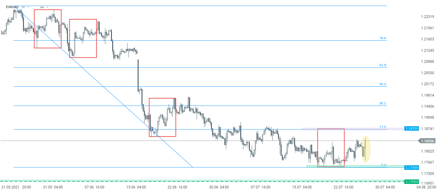 Pomimo dynamicznej reakcji na EURUSD, sytuacja na interwale H4 nie uległa zmianie. Kluczowym oporem pozostaje strefa przy 1,1875. Źródło: xStation5
