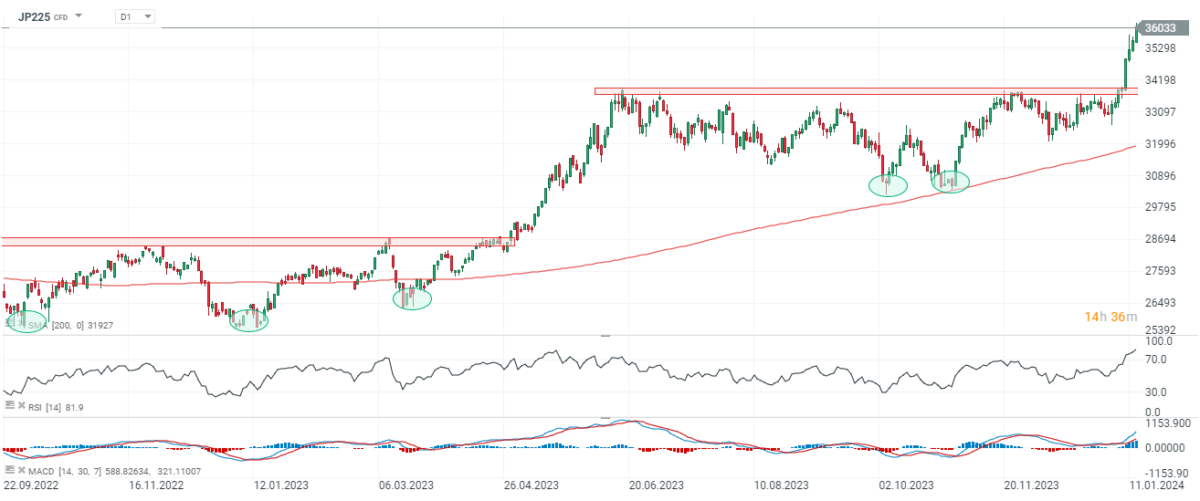 Kontrakty terminowe na główny, japoński indeks akcji Nikkei225 notują dziś ponad 1,3% rajd, a spotowy benchmark wspiął się w trakcie sesji azjatyckiej na poziom 36,008 punktów, niewidziany od ponad 34 lat (luty 1990). Dalsza stabilizacja jena japońskiego na niższych poziomach i spadek rentowności obligacji USA napędzają notowania akcji. Ze szczególnym uwzględnieniem akcji eksporterów, którzy odniosą dodatkowe zyski z uwagi na przewalutowania oraz spedytorów, którzy mogą windować stawki z uwagi na wzrost ryzyka geopolitycznego.