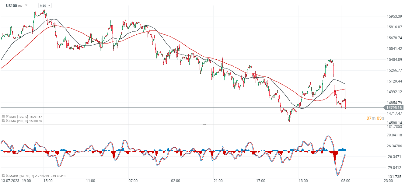 Na US100 widzimy wzrosty w pierwszej reakcji, a następnie cofnięcie się indeksu do poziomu przed przemową. Obecnie indeks kontynuuje spadki i jeśli presja spadkowa się utrzyma to niewykluczone będzie ponowne przetestowanie oporu na 14600 punktów - ostatniego lokalnego dołka.