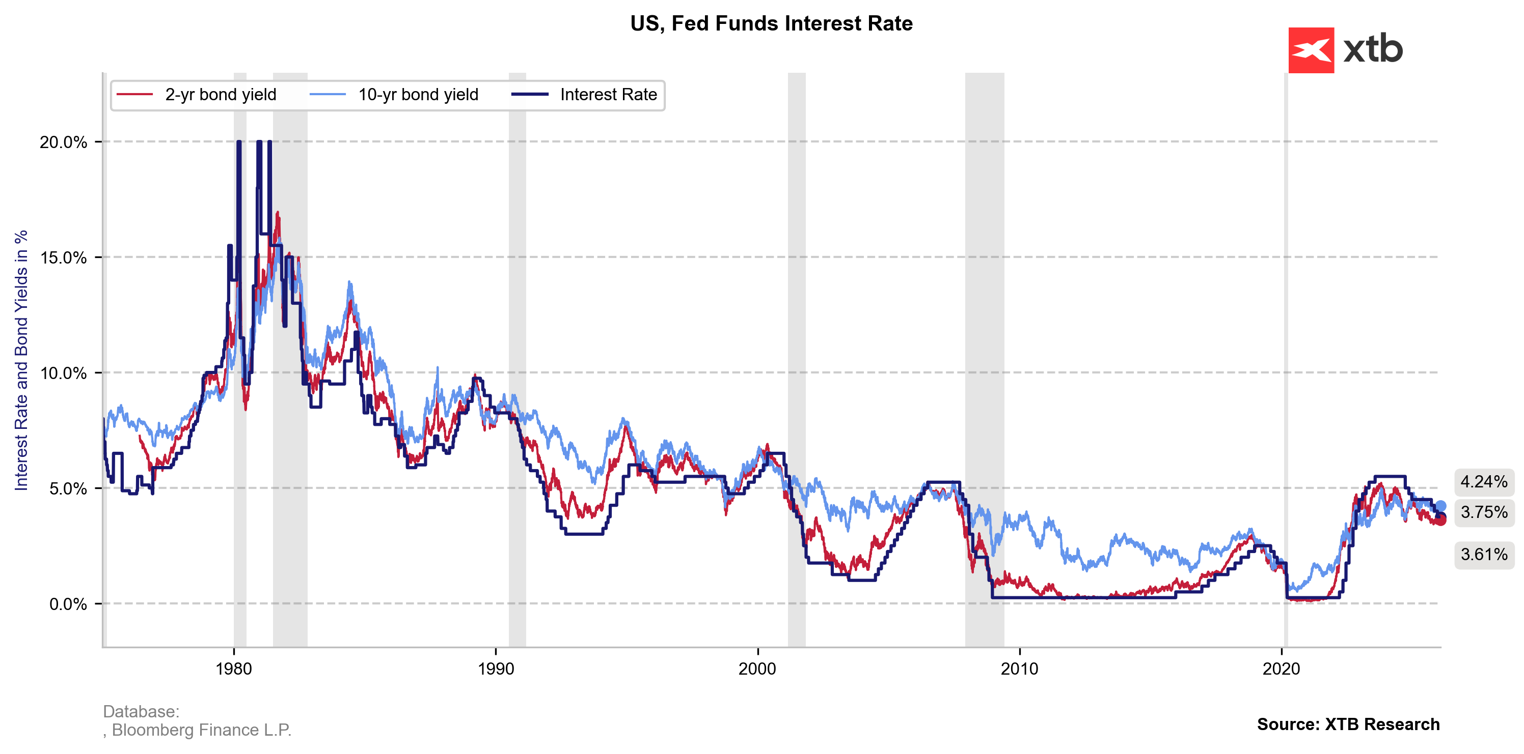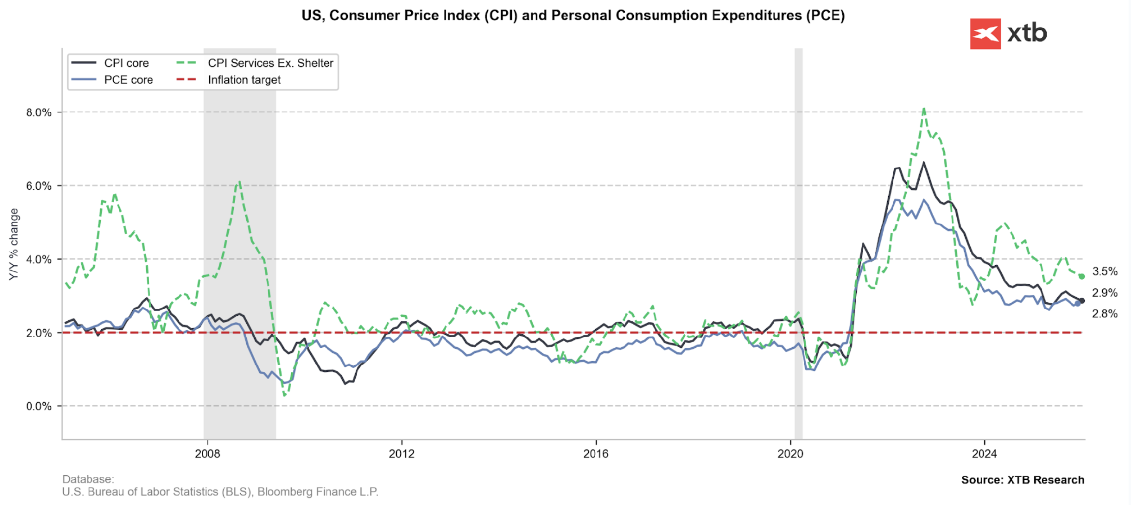 Bazowa inflacja PCE wróciła w listopadzie do 2,8%, a dalszy transfer ceł na konsumentów w połączeniu z rosnącą aktywnością mogą zwiększyć ryzyko powrotu do 3%. Źródło: XTB Research