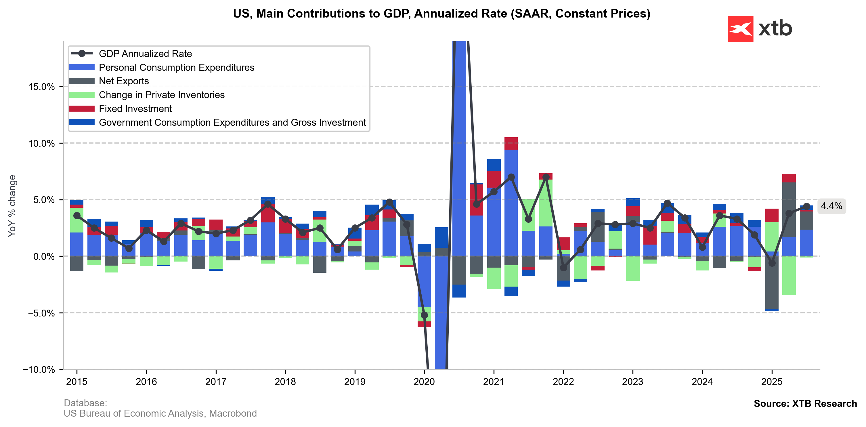 Rewizja PKB w III kw. 2025 roku z 4,3% do 4,4% potwierdziła przeważający wkład popytu konsumentów na wzrost gospodarki USA oraz ujawniła większy niż zakładano poziom inwestycji biznesowych. Obustronny optymizm stanowi zatem ryzyko dla lepkiej inflacji, która ponownie zbliża się do 3%. Źródło: XTB Research