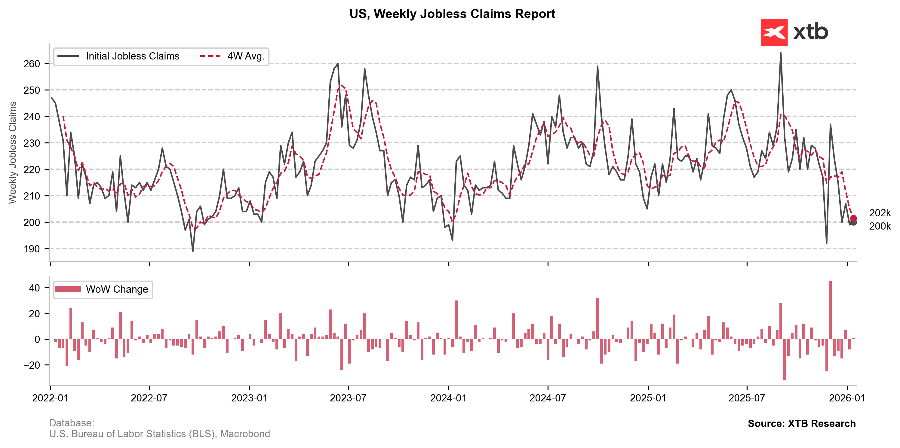 Ostry trend spadkowy na wnioskach o zasiłek dla bezrobotnych powinien zmniejszyć obawy o potencjalne odbicie stopy bezrobocia. Źródło: XTB Research