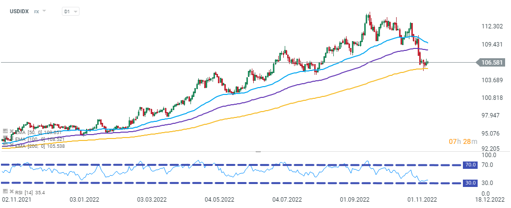 Ostatnia korekta na rynku dolara amerykańskiego zatrzymała się na wsparciu wyznaczonym przez 200- dniową, wykładniczą średnią kroczącą (złota krzywa). Źródło: xStation 5