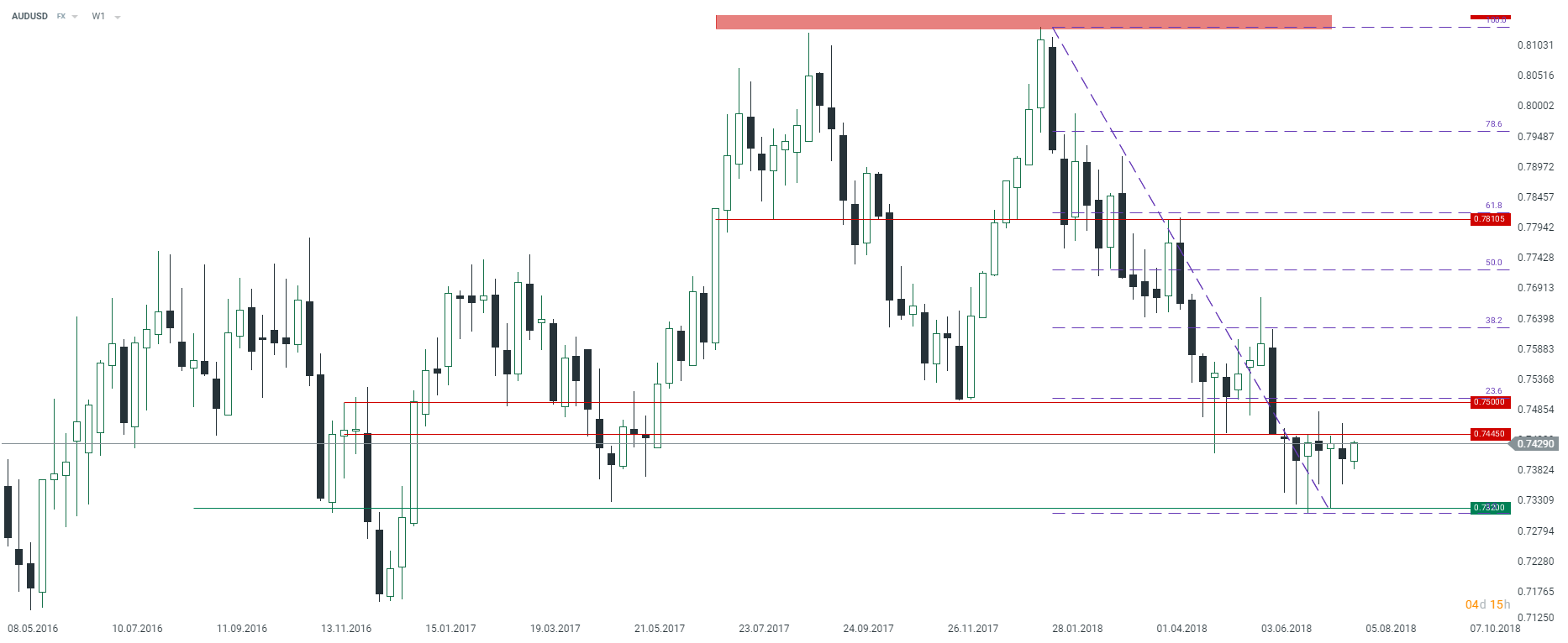 Z perspektywy długoterminowej można zauważyć, że para nie jest w stanie przełamać kluczowego wsparcia na 0,7320. Pierwsza poważna przeszkoda może być już zlokalizowana w okolicy 0,7445, i musi zostać pokonana, aby cena wzrosła do 0,75, a może nawet dalej. Źródło: xStation5.