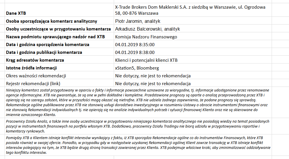 Ta publikacja handlowa jest informacyjna i edukacyjna. Nie jest rekomendacją inwestycyjną ani informacją rekomendującą lub sugerującą strategię inwestycyjną. W materiale nie sugerujemy żadnej strategii inwestycyjnej ani nie świadczymy usługi doradztwa inwestycyjnego. Materiał nie uwzględnia indywidualnej sytuacji finansowej, potrzeb i celów inwestycyjnych klienta. Nie jest też ofertą sprzedaży ani subskrypcji. Nie jest zaproszeniem do nabycia, reklamą ani promocją jakichkolwiek instrumentów finansowych. Publikację handlową przygotowaliśmy starannie i obiektywnie. Przedstawiamy stan faktyczny znany autorom w chwili tworzenia dokumentu. Nie umieszczamy w nim żadnych elementów oceniających. Informacje i badania oparte na historycznych danych lub wynikach oraz prognozy nie stanowią pewnego wskaźnika na przyszłość. Nie odpowiadamy za Twoje działania lub zaniechania, zwłaszcza za to, że zdecydujesz się nabyć lub zbyć instrumenty finansowe na podstawie informacji z tej publikacji handlowej. Nie odpowiadamy też za szkody, które mogą wynikać z bezpośredniego czy też pośredniego wykorzystania tych informacji. Inwestowanie jest ryzykowne. Inwestuj odpowiedzialnie.