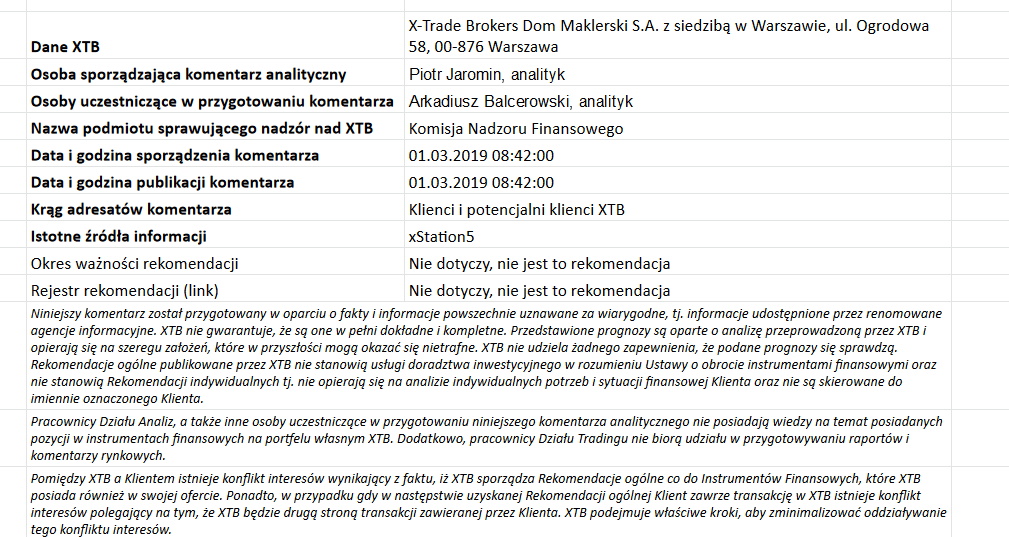Ta publikacja handlowa jest informacyjna i edukacyjna. Nie jest rekomendacją inwestycyjną ani informacją rekomendującą lub sugerującą strategię inwestycyjną. W materiale nie sugerujemy żadnej strategii inwestycyjnej ani nie świadczymy usługi doradztwa inwestycyjnego. Materiał nie uwzględnia indywidualnej sytuacji finansowej, potrzeb i celów inwestycyjnych klienta. Nie jest też ofertą sprzedaży ani subskrypcji. Nie jest zaproszeniem do nabycia, reklamą ani promocją jakichkolwiek instrumentów finansowych. Publikację handlową przygotowaliśmy starannie i obiektywnie. Przedstawiamy stan faktyczny znany autorom w chwili tworzenia dokumentu. Nie umieszczamy w nim żadnych elementów oceniających. Informacje i badania oparte na historycznych danych lub wynikach oraz prognozy nie stanowią pewnego wskaźnika na przyszłość. Nie odpowiadamy za Twoje działania lub zaniechania, zwłaszcza za to, że zdecydujesz się nabyć lub zbyć instrumenty finansowe na podstawie informacji z tej publikacji handlowej. Nie odpowiadamy też za szkody, które mogą wynikać z bezpośredniego czy też pośredniego wykorzystania tych informacji. Inwestowanie jest ryzykowne. Inwestuj odpowiedzialnie.