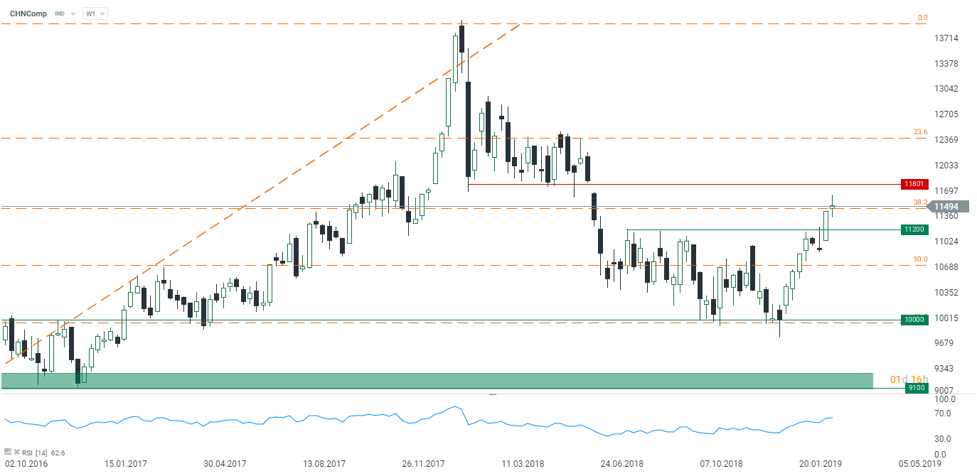 Hang Seng (CHNComp) pozostał w tym tygodniu praktycznie bez zmian, główną barierą dla byków pozostają okolice 11800 punktów. Źródło: xStation5.