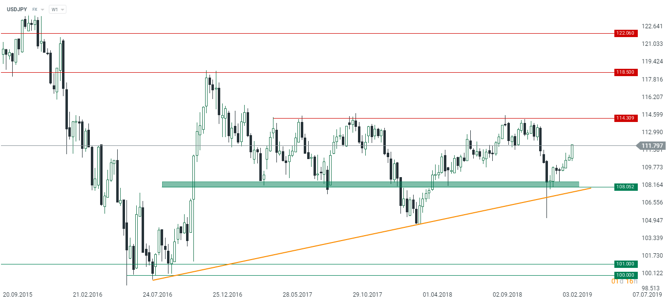 USDJPY powoli wraca w rejon 114,3, która jest główną przeszkodą dla byków w ostatnich kilkunastu miesiącach. Źródło: xStation5.