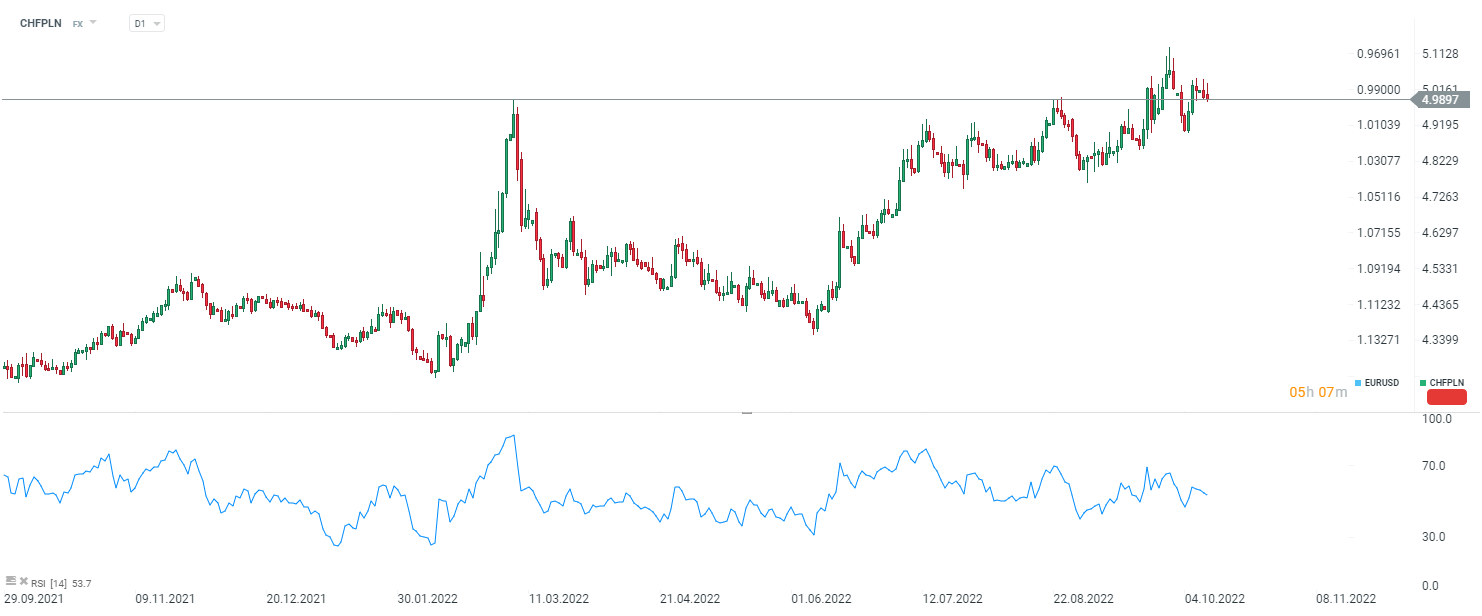 Na rynku widać jednak lekki oddech, który prowadzi do osłabienia "walut bezpiecznych" takich jak dolar czy również frank. CHFPLN poniżej 5 zł. Źródło: xStation5