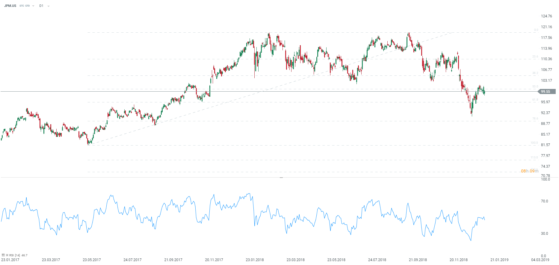 Rozpoczyna się kolejny sezon wyników, ostatni za 2018 rok, dlatego uwagę rynków skupiają w tym tygodniu przede wszystkim banki. Przed sesja na Wall Street swoje wyniki opublikował JP Morgan. Wyniki finansowe tego banku nie zachwyciły i okazały się być gorsze od oczekiwań rynkowych, pierwszy raz od 15 kwartałów. Spółka pokazała przychody na poziomie 26,1 mld USD z oczekiwaniami na poziomie 26,7 mld USD oraz przy EPS na poziomie 1,98 USD przy oczekiwaniach na poziomie 2,21 USD.