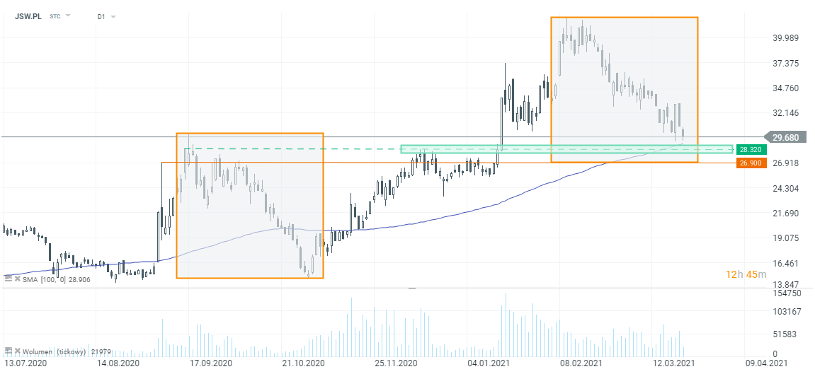 Wczorajsza wyprzedaż walorów JSW sięgnęła 6,64%. W trakcie dzisiejszej sesji znów dominuje strona podażowa i spadki sięgają około 4%. Patrząc na wykres dzienny, kurs zbliża się do ważnego wsparcia w okolicy 28,320 zł i jednocześnie do 100-sesyjnej średniej kroczącej. W razie wybicia dołem i kontynuacji spadków, uwaga mogłaby skupić się następnie na poziomie 26,900 zł - jest to dolne ograniczenie struktury Overbalance. W związku z powyższym, obrona tych poziomów jest z perspektywy byków kluczowa.