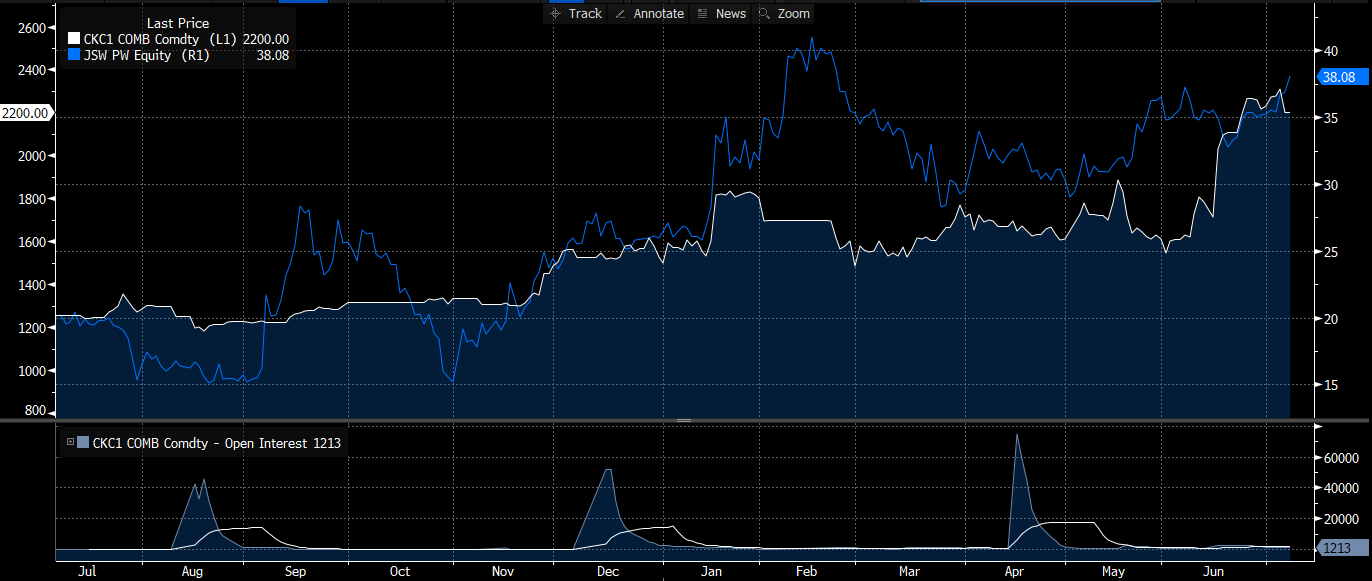 Kurs JSW.PL na tle cen węgla koksowego. Źródło: Bloomberg