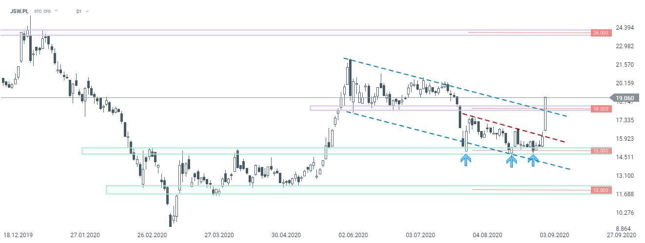 JSW zyskuje dziś ponad 15% i wyraźnie wybija górą kanał spadkowy. Jednocześnie doszło do przebicia ważnego poziomu 18,200 zł, który w okresie czerwiec-lipiec stanowił kluczowy poziom wsparcia. Źródło: xStation5