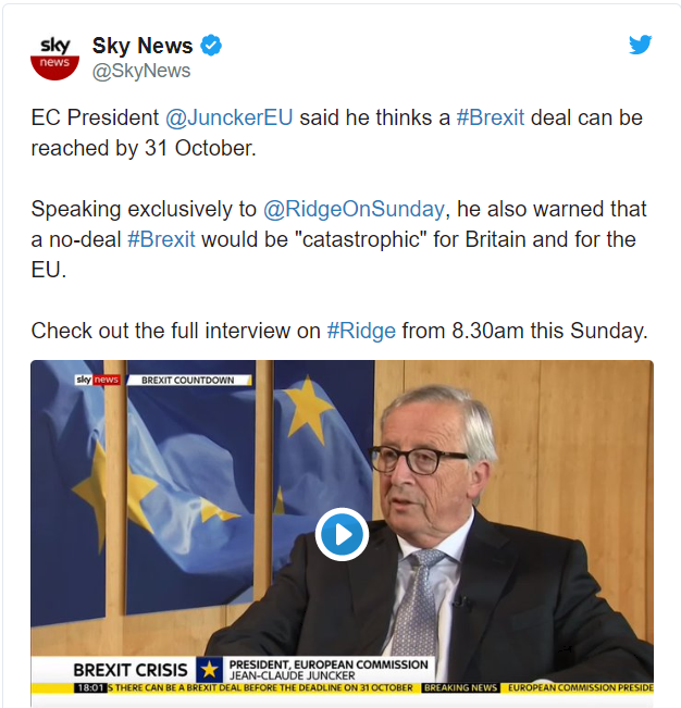 Przewodniczący Komisji Europejskiej powiedział, że Brexit bez porozumienia byłby „katastrofalny”, a on "zrobi wszystko, aby uzyskać umowę". Według niego do 31 października może dojść do porozumienia w sprawie Brexitu