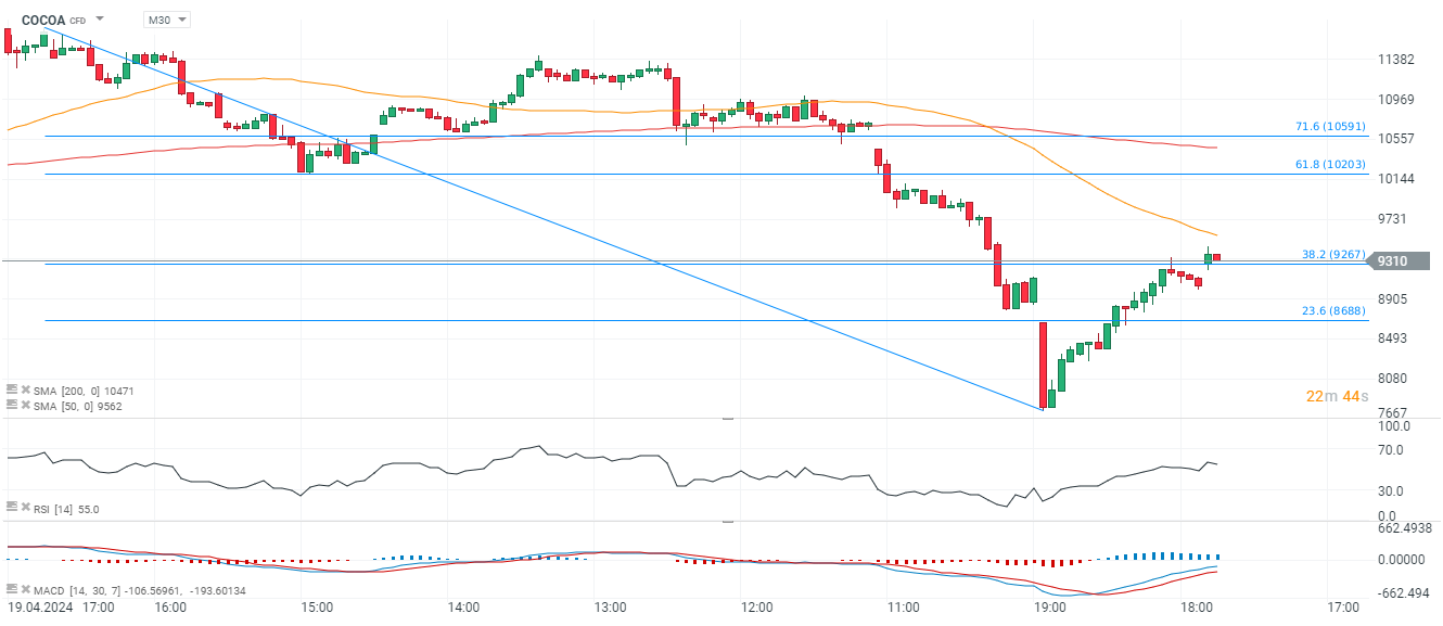 Kontrakty terminowe na kakao, w ciągu ostatnich dwóch sesji straciły ponad 27%, zbliżając się do rekordowego dwudniowego spadku, z 1960 roku. Blisko 20% odbicie od dołka może sygnalizować, że choć płynność jest niewielka, rynek w dalszym ciągu obawia się ograniczeń w podaży surowca, gdy Afryka Zachodnia odpowiadająca za ponad połowę światowej podaży zmaga się z wyzwaniami pogodowymi, kryzysem starzejących drzew i plagami ograniczającymi zbiory kakaowca. Obecnie kontrakty terminowe na kakao zyskują prawie 3% i od wczorajszych, lokalnych minimów miesięcznych w okolicach 7700 USD za tonę zdołały odbić już o prawie 20%.